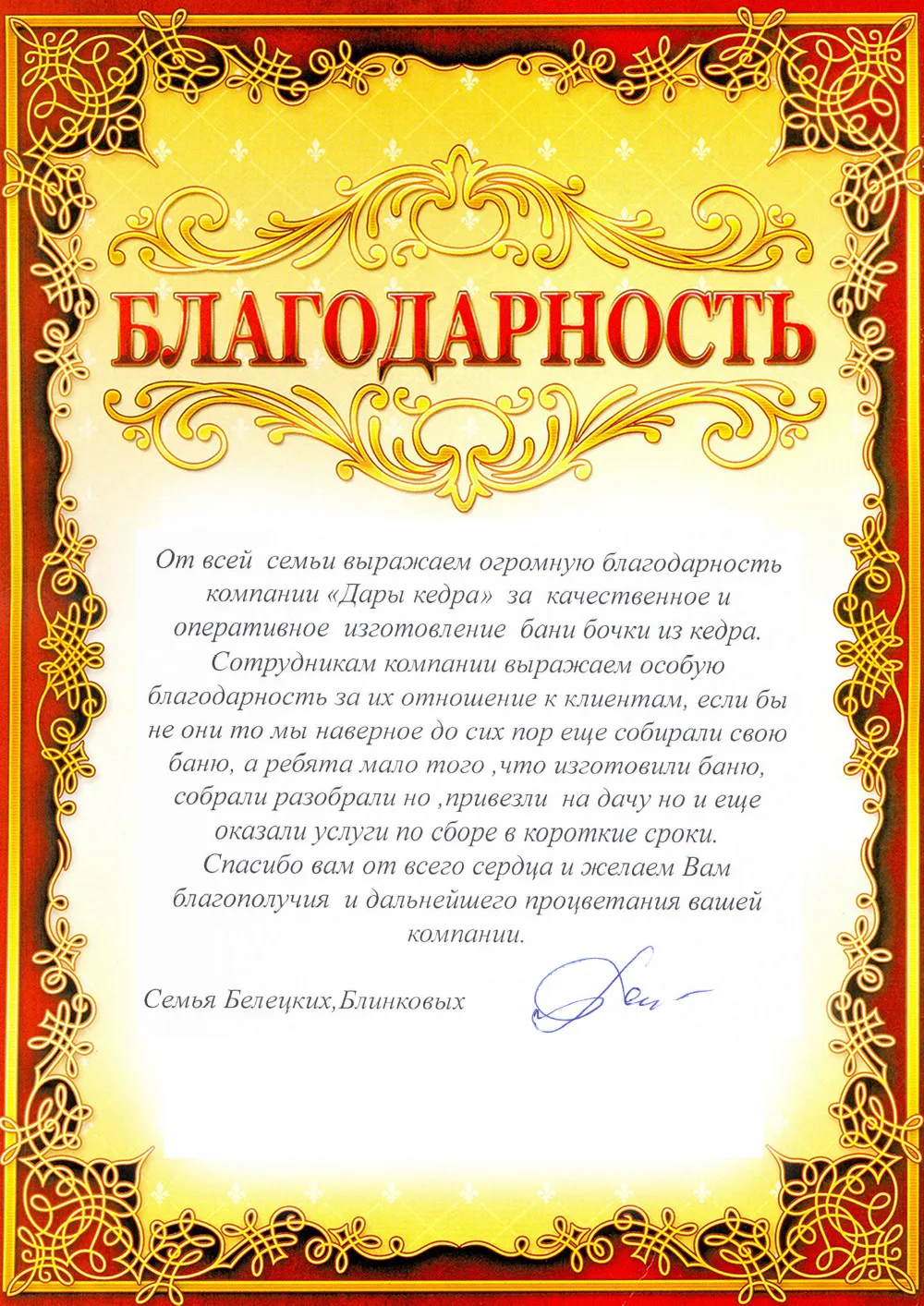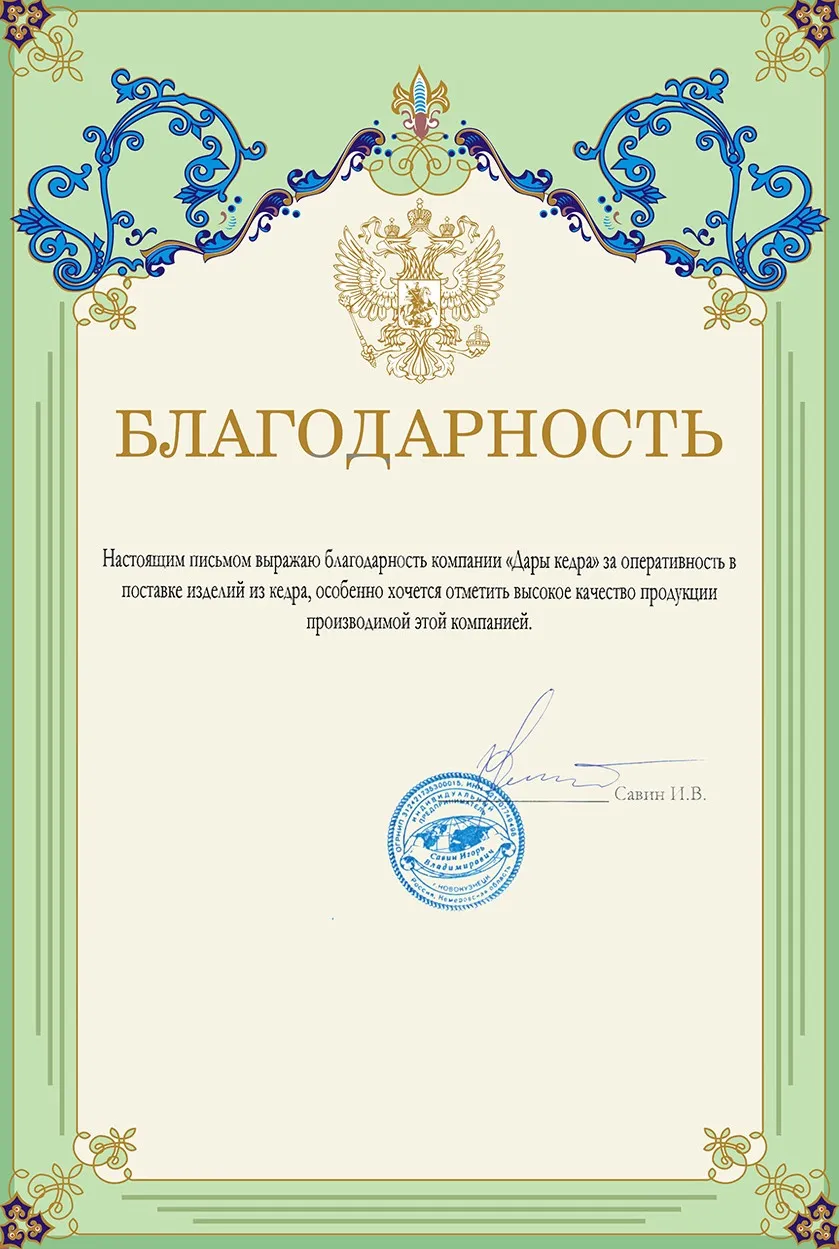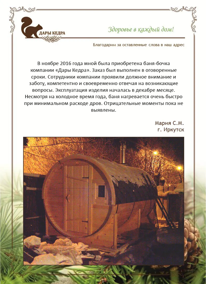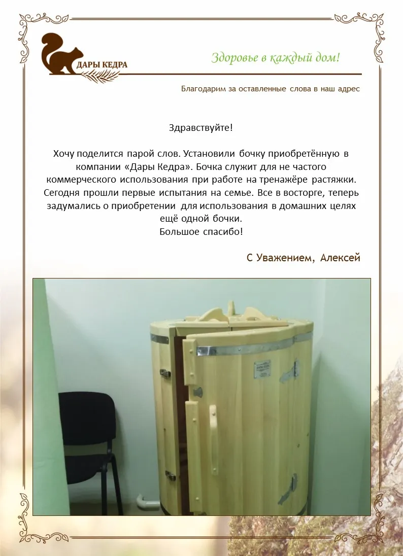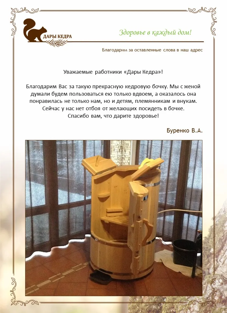 Уважаемая компания «Дары Кедра», хотим поблагодарить Вас за отличное качество товара! Удовольствие, которое испытали сами и наши клиенты после сеансов фитобочки, говорят сами за себя!