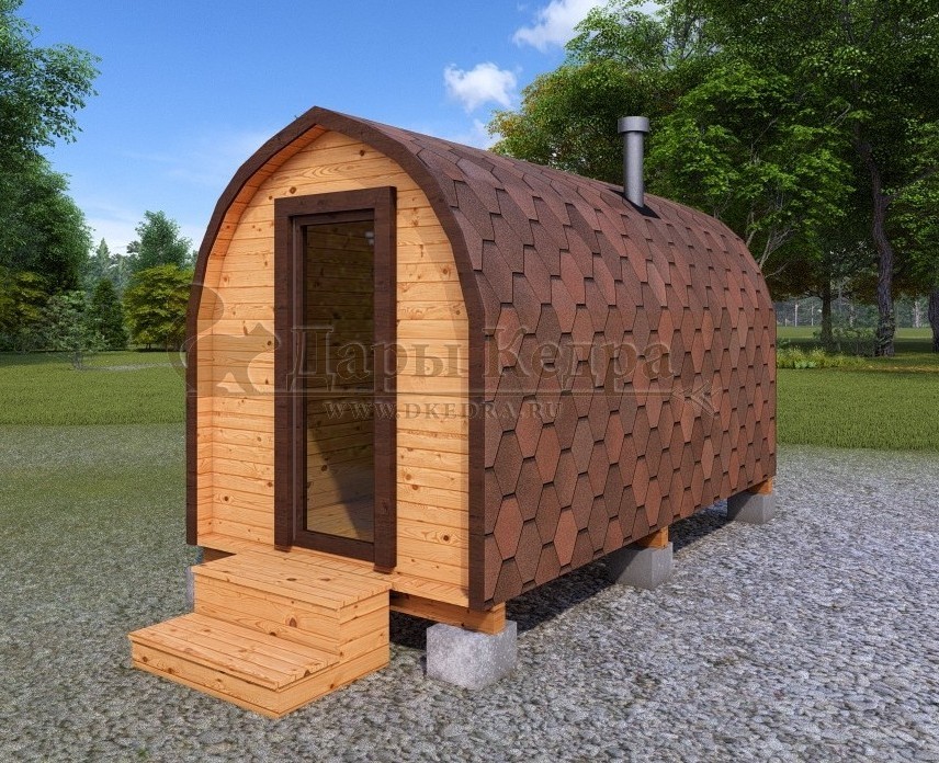 Баня-бочка представляет собой конструкцию в виде бочонка без углов. Такая форма считается оптимальной для равномерного распределения пара по всей внутренней поверхности парной. Таким образом, пар не скапливается в одном месте, а циркулирует по всему объему. Соответственно, круглая (квадратная, овальная) баня экономичная: топится быстро, требует дров мало.