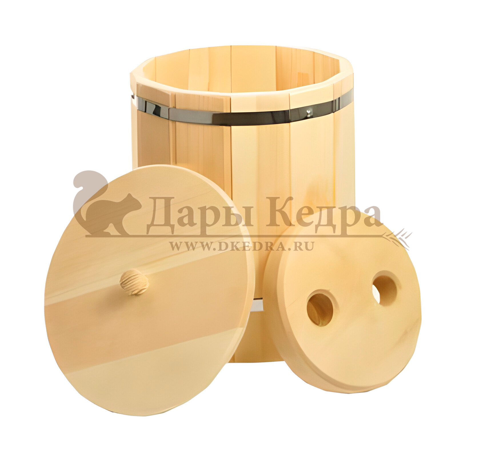 • Кадка для засолки из кедра Кадка кедровая для засолки и хранения продуктов является «стоячей тарой», в отличие от бочки ее нельзя герметично закрыть, положить на бок и покатить. По этой причине разнообразие объемов кадки остается в пределах 60 л. Покупают кадки для засолки исключительно для удобного хранения в подвале, на складе и других местах. Перед началом использования кадки необходимо залить её водой на сутки для насыщения древесины влагой.