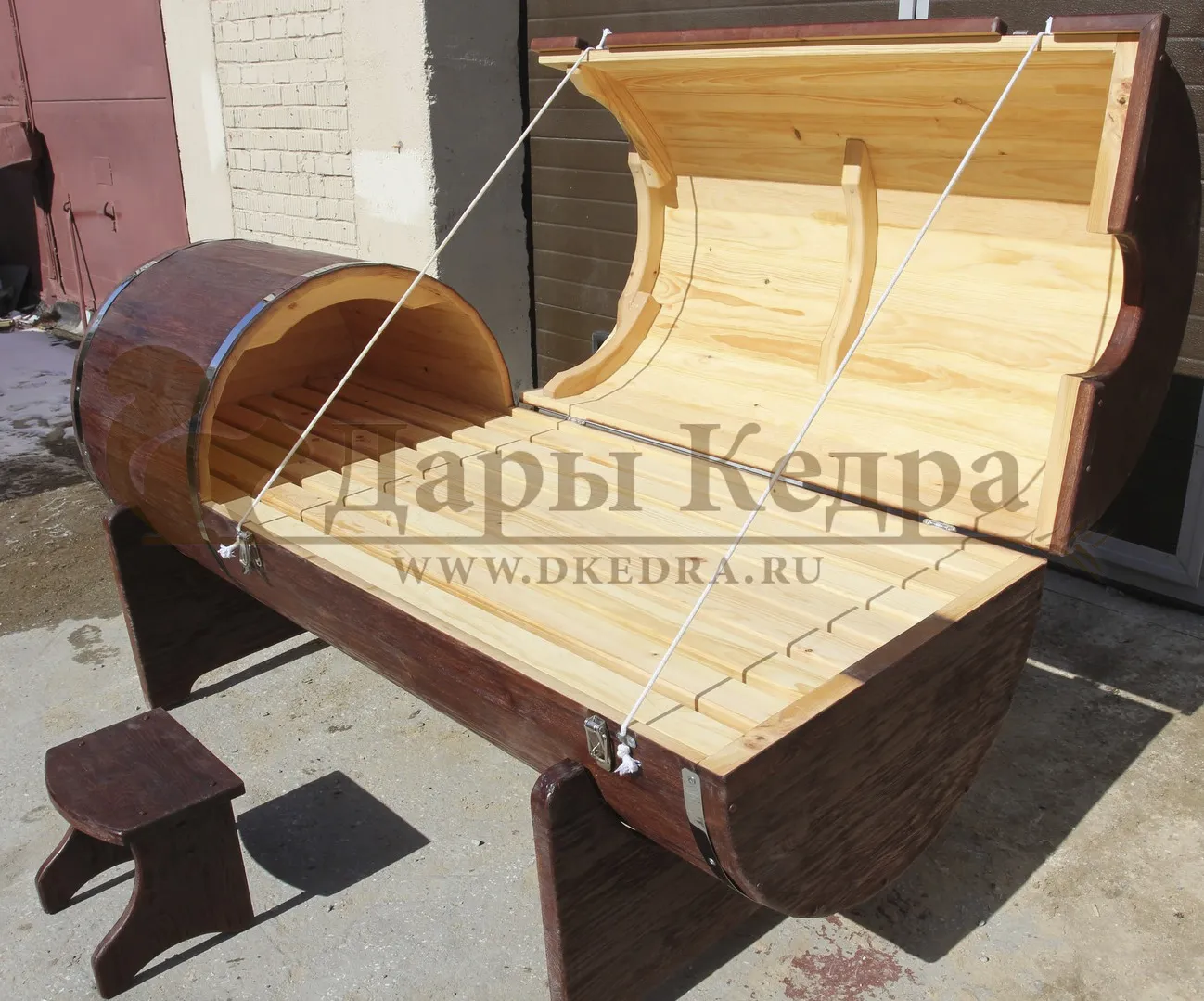 Это горизонтальная фитобочка с эксклюзивным оформлением, покрытием в цвет или резьбой. Индивидуальная модель придаст вашему изделию оригинальный внешний вид. Парение в фитобочке благотворно влияет на организм в целом: повышается иммунитет, выводятся шлаки и токсины, улучшается работа органов тела и состояние кожи. Подходит для коммерции.