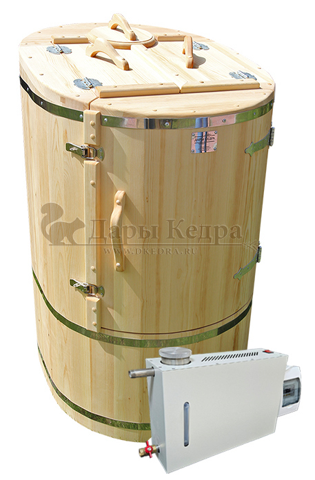 Готовый комплект «Универсальный»: кедровая бочка с парогенератором + био-защита изнутри и снаружи Готовый комплект - это полностью укомплектованный набор с фитобочкой для процедур парения. Овальная модель более просторна и удобна в использовании. Толщина стенок составляет 40-45 мм, что позволяет увеличить срок службы изделия. Верхний скос делает положение головы более комфортным и улучшает обзор. Фитобочка оборудована откидными створками, дверцей и отверстием для головы. Во время парения человек сидит внутри кедровой бочки, а голова находится снаружи. Благодаря этому исключается возможность перегрева. Подлокотники из кедра, встроенные ручки на створках и двери делают эксплуатацию более удобной. Парение в фитобочке благотворно влияет на организм в целом: повышается иммунитет, выводятся шлаки и токсины, улучшается работа органов тела и состояние кожи.