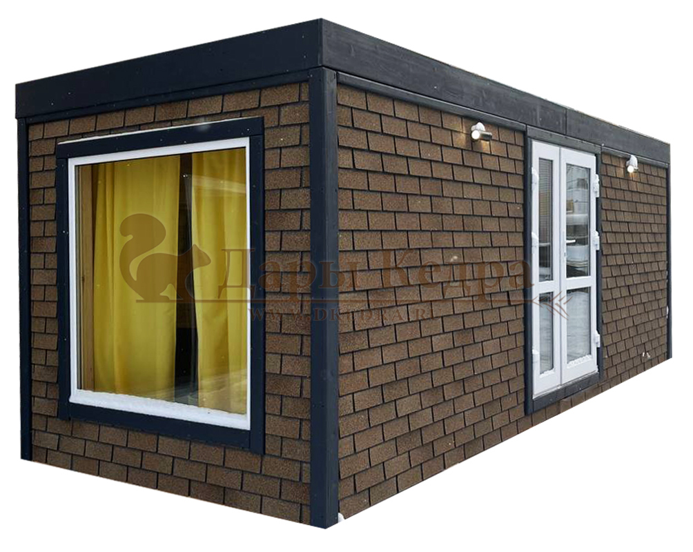 Утеплённый зимний кемпинг-дом «Панорама» с боковым входом Это утепленный домик прямоугольной формы с панорамным окном и двумя помещениями: жилой комнатой и санузлом с душевой зоной. Может быть изготовлен по готовым стандартам или вашим индивидуальным размерам. Современные материалы, используемые при проектировании, отличаются экологичностью и прочностью. Теплоизоляция стен, пола, потолка выполнена с помощью минеральной ваты, экологичной и устойчивой к поражениям насекомых. Для исключения воздействия неблагоприятных факторов внешней среды снаружи используются гидро- и ветрозащитные пленки. Финишным укрывным материалом стен является сайдинг, имитирующий брус или кирпич.