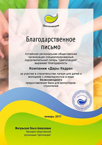 Спасибо компании Дары Кедра за шикарный подарок - кедровую - баню-бочку для строителей-волонтеров лагеря, для детей с инвалидностью "Цветоландия". В конце 2016 мы обратились к руководству компании и они пошли нам навстречу, за что от волонтеров, детей, родителей команды лагеря - ОГРОМНОЕ СПАСИБО! Компании, которые думают об окружающих их людях, помогают им - достойны уважения. Дары Кедра + Цветоландия = друзья forever !!!