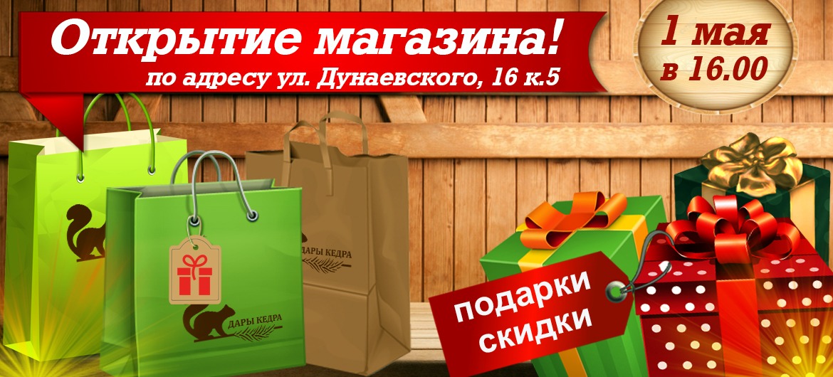 Приглашаем Вас 1 мая в 16.00 на открытие торгово-выставочного зала по адресу ул. Дунаевского, 16 к.5. Всех гостей ждет беспроигрышная лотерея – подарки получат все пришедшие в этот день! Что для этого нужно? Запомнить промо-код (ДКН) и прийти на открытие. Среди подарков: кедровые шайки и ковши, запарники, банные шапки и рукавицы, ароматные фитосборы и фиточаи.