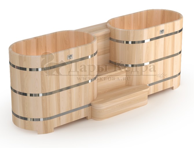 Двойная купель из кедра чаще всего используется в крупных банных комплексах и оздоровительных центрах. Она представляет собой две овальные чаши для воды, в которых люди отдыхают после парения. Между купелями установлен широкий подиум из кедра, по которому могут спускаться и подниматься сразу несколько людей. Для комфортного отдыха купель оснащена лавочками и двумя дополнительными лестницами. Обручи из нержавеющей стали декорируют изделие и равномерно распределяют нагрузку воды во время пользования. При правильном уходе купель для бани не рассыхается и не подвергается гниению.