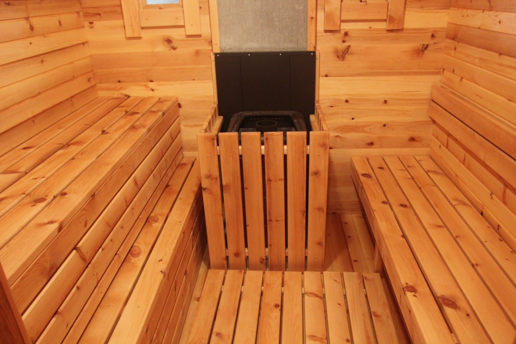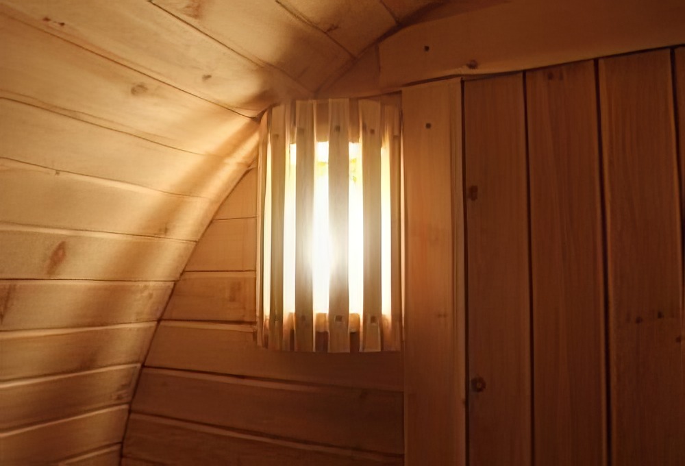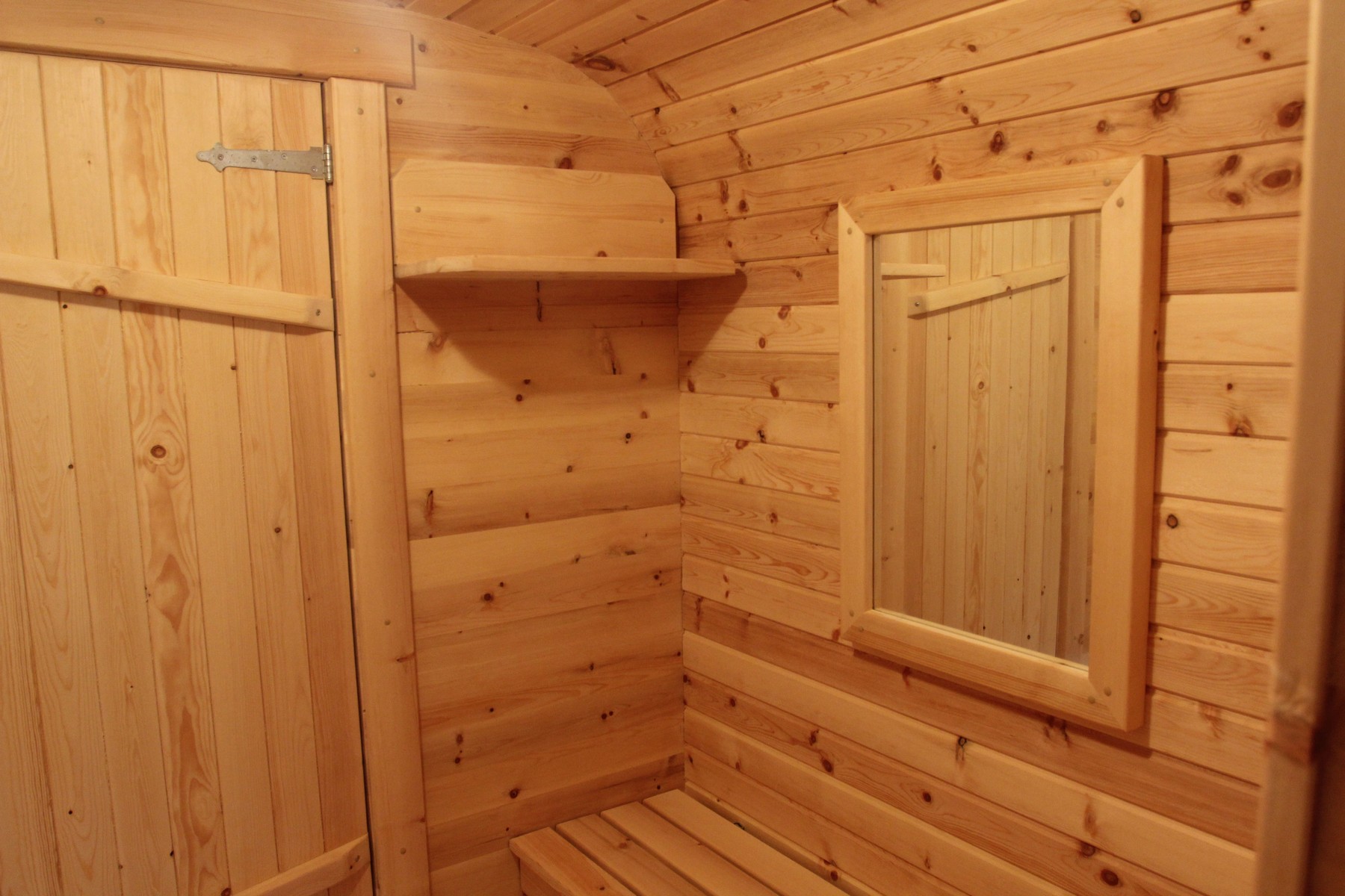 Стильная и современная баня-бочка может быть выполнена длиною от 3 метров, что-бы парильное отделение было не менее 2,5 метров для безопасного расстояния человека от печи. Полок одноуровневый, что позволяет в полной мере наслаждаться видом из панорамного окна. Печь идёт с внутренней топкой по центру, её можно установить сбоку с топкой внутри, снаружи, либо вынести топку в соседнее отделение. Печь можно укомплектовать баком для воды, а саму баню сделать длиною до 6 метров, комфортно разместив в ней дополнительно помывочную и комнату отдыха.